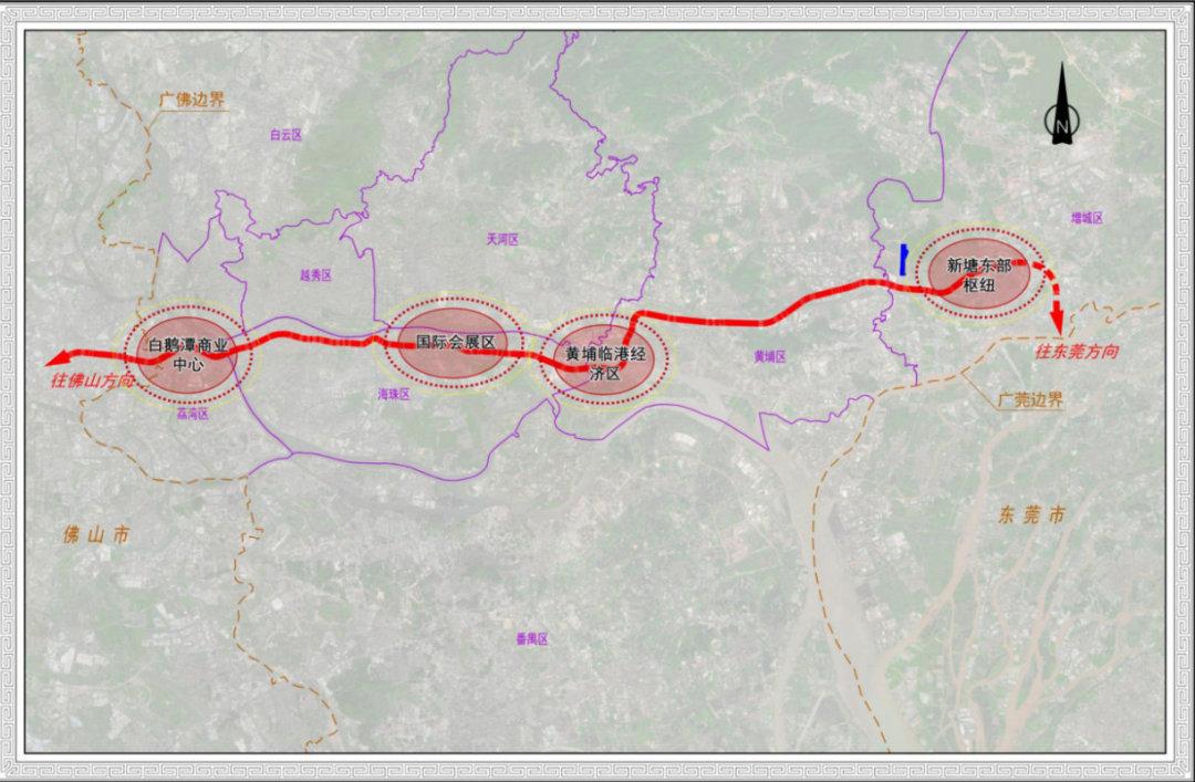 佛穗莞城际全称为佛山经广州至东莞城际铁路,线路将先行建设佛山鹭洲至广州新塘段,本次公示的是其中的广州段。广州段自广佛边界经荔湾区、海珠区、黄埔区、增城区,线路全长约45.1km,为全地下敷设,设车辆段一座,主变电所两座。总工期约5年半。