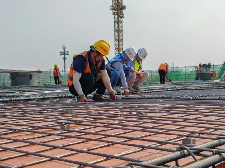 此次主站房高架层混凝土结构施工,共浇筑9块结构板,施工面积近15800平方米,布设钢筋近2200吨,混凝土浇筑量近11000方。为保证施工安全,项目团队严格落实安全穿透式管理理念,在现场划分7个安全责任单元,构建“安全有网、网中有格、格中定人、人负其责”的管理体系。