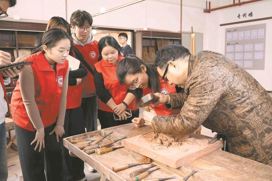广东青年大学生“百千万工程”突击队队员向非遗传承人学习雕刻工艺