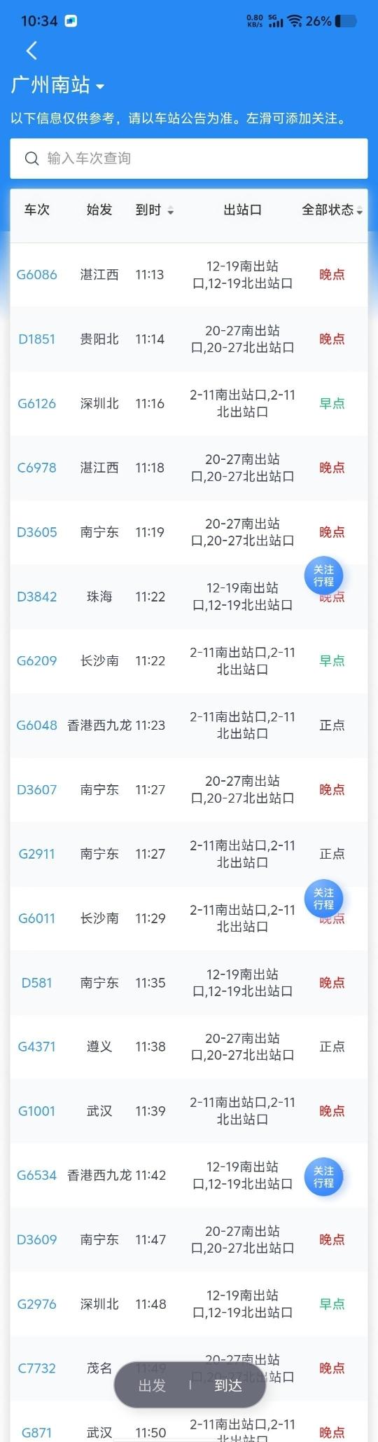 记者今日10时许查询12306发现,从11时到13时,有大概30趟到达广州南站的列车晚点,下午也有多趟列车显示晚点。