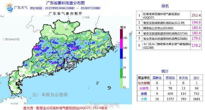 广东省气象部门监测显示,6日白天到7日早晨,粤北偏南、珠江三角洲、粤东的部分市县、阳江和茂名出现了大雨,局部暴雨或大暴雨,其中阳江局地出现了特大暴雨(阳江阳春市圭岗镇252.4毫米)。