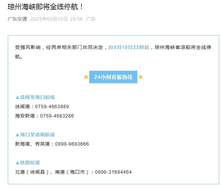 广东交通微信公众号消息,受强风影响,经琼州海峡南北两岸相关部门共同决定,自5月10日23时起,琼州海峡客滚船将全线停航。