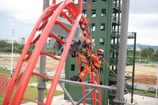 在相邻的高空训练塔,记者看到指战员们正进行过山车事故专项演练:当模拟伤员因倒挂陷入昏迷,救援组需在15米高空搭建斜向救援系统,采用担架将伤员在高空中固定,并平移至安全区域。