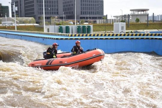 在实训演练区域,记者看到现场的设施设备不仅逼真,而且科技感满满。这里不仅有全国首创的台风综合模拟训练馆,还有地下空间积水救援训练单元和全亚洲规模最大、流态最丰富的急流救援训练水道。占地500亩、涵盖5大训练板块、27个训练单元、108个训练科目……救援中心内训练种类齐全、设施完备,堪称应急救援的“黄埔军校”。