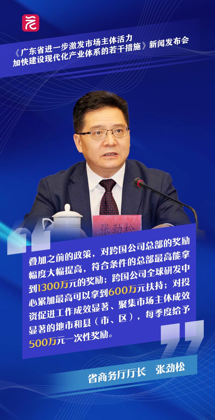 “广东拥有庞大的消费市场、完善的产业链供应链、高素质的劳动人口、优良的营商环境,始终是全球企业投资的首选目的地,我们热诚希望全球企业把握广东出台《若干措施》的契机,进一步投资广东、扎根广东,把项目落下来、把资金投进来、把生意做起来,在广东高水平开放、高质量发展的重大历史机遇中实现企业更好地发展。”张劲松表示,目前省相关部门正在抓紧制定实施细则,力争尽快让大家用好政策、享受政策。