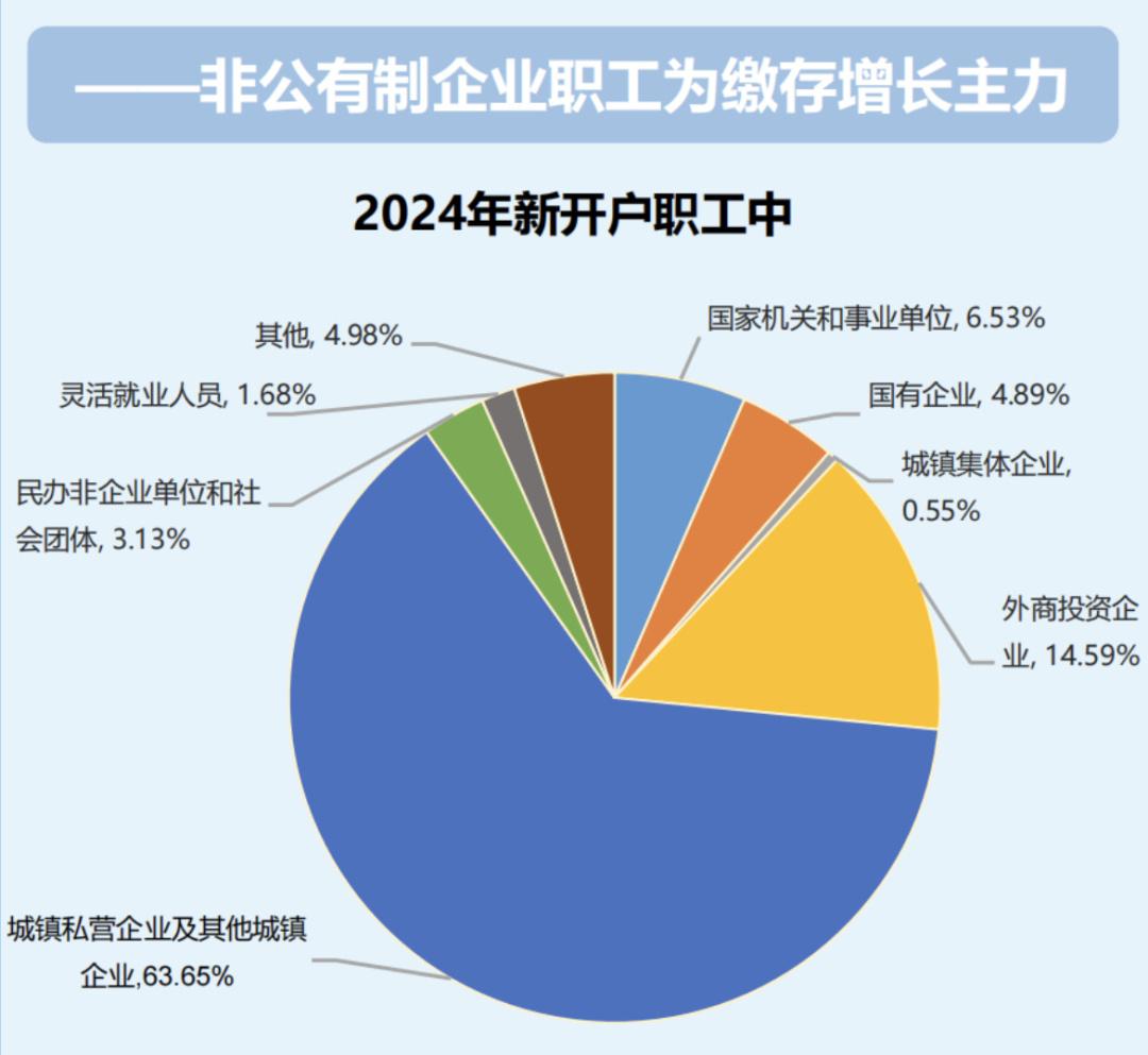非公有制企业职工为缴存增长的主力。新开户职工中,国家机关和事业单位占6.53%,国有企业占4.89%,城镇集体企业占0.55%,外商投资企业占14.59%,城镇私营企业及其他城镇企业占63.65%,民办非企业单位和社会团体占3.13%,灵活就业人员占1.68%,其他占4.98%。近五年,全省新开户职工中,非公有制单位职工占比持续稳定在80%以上。
