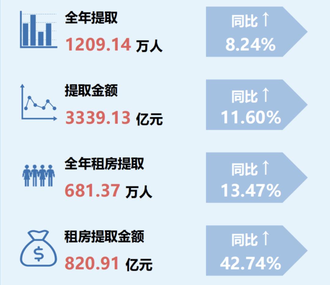 2024年,全省共有1209.14万人提取住房公积金,合共3339.13亿元。其中,681.37万人用于租房(占比56.35%),提取金额共计820.91亿元,同比增长13.47%、42.74%,人数及金额均占全国比例近1/3。