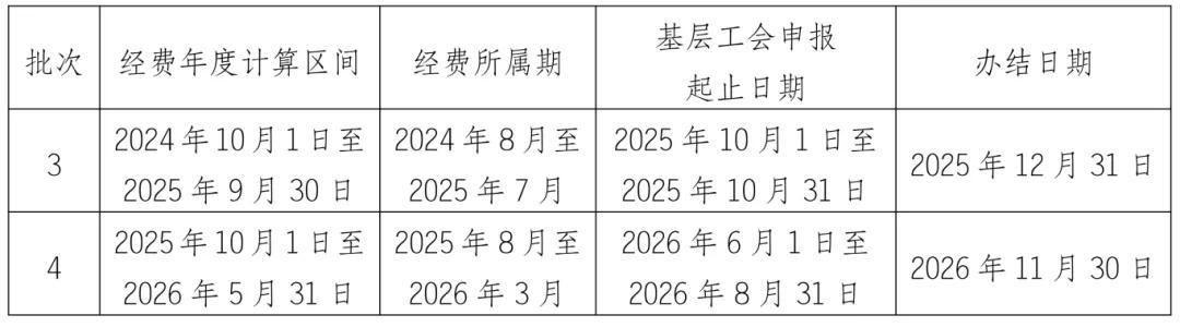按照新的政策时限,对《关于实施小额缴费工会组织工会经费全额返还支持政策的通知》中的第3批次进行调整,并新增第4批次,具体如下: