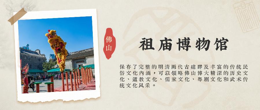 祖庙博物馆辖区包括祖庙古建筑群、佛山祖庙历史文化陈列展览馆、孔庙、黄飞鸿纪念馆、叶问堂等。祖庙博物馆馆藏文物以道教文物及佛山地方民俗文物为主。基本陈列充分展示佛山祖庙历史文化、道教文化、武术文化、佛山民间工艺等。