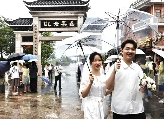 “5·20”前夕,素有“千年古镇 人间正果”美誉、有着1700多年历史的广州增城正果老街作为“双主会场”之一,迎来了一场浪漫的2025年广东青年集体婚礼。5月19日上午,100对新人在风景优美的南昆山麓、增江画廊,以青山为聘、碧水为媒,在雨中携手穿过“正果老街”牌坊,共谱“喜粤良缘 修成正果”的爱情诗篇。