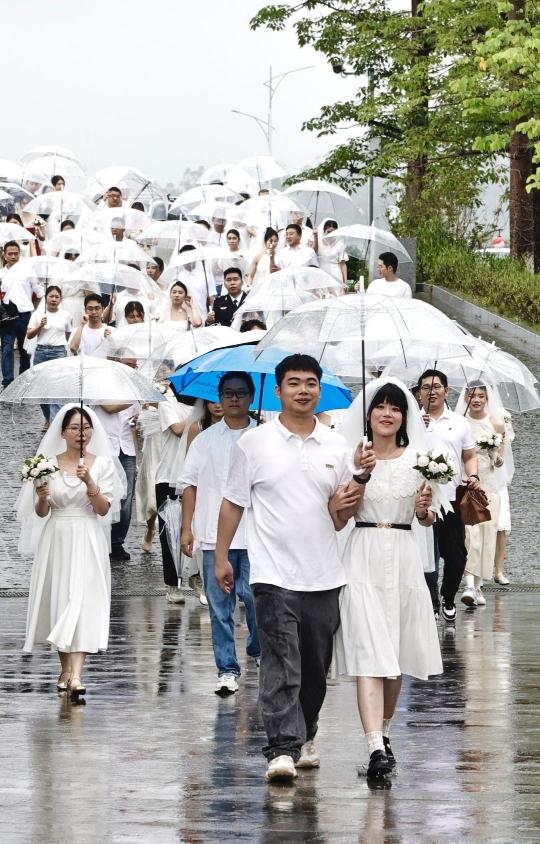 活动中,随着雨势渐起,百对新人共同撑着雨伞唱响《今天你要嫁给我》;省青联委员、青年歌唱家陈筱棠演唱《我的广东我的家》。