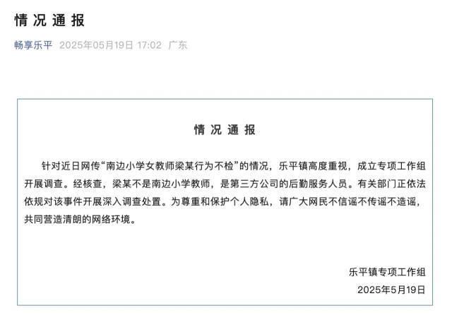 5月19日,广东佛山市乐平镇专项工作组发布情况通报称,针对近日网传“南边小学女教师梁某行为不检”的情况,乐平镇高度重视,成立专项工作组开展调查。经核查,梁某不是南边小学教师,是第三方公司的后勤服务人员。有关部门正依法依规对该事件开展深入调查处置。为尊重和保护个人隐私,请广大网民不信谣不传谣不造谣,共同营造清朗的网络环境。
