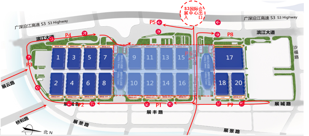 展期小车停车场:展商及观众小车主要停放地下一层二层C/D/E/F/G/区,H/K/M作为备用停车区。