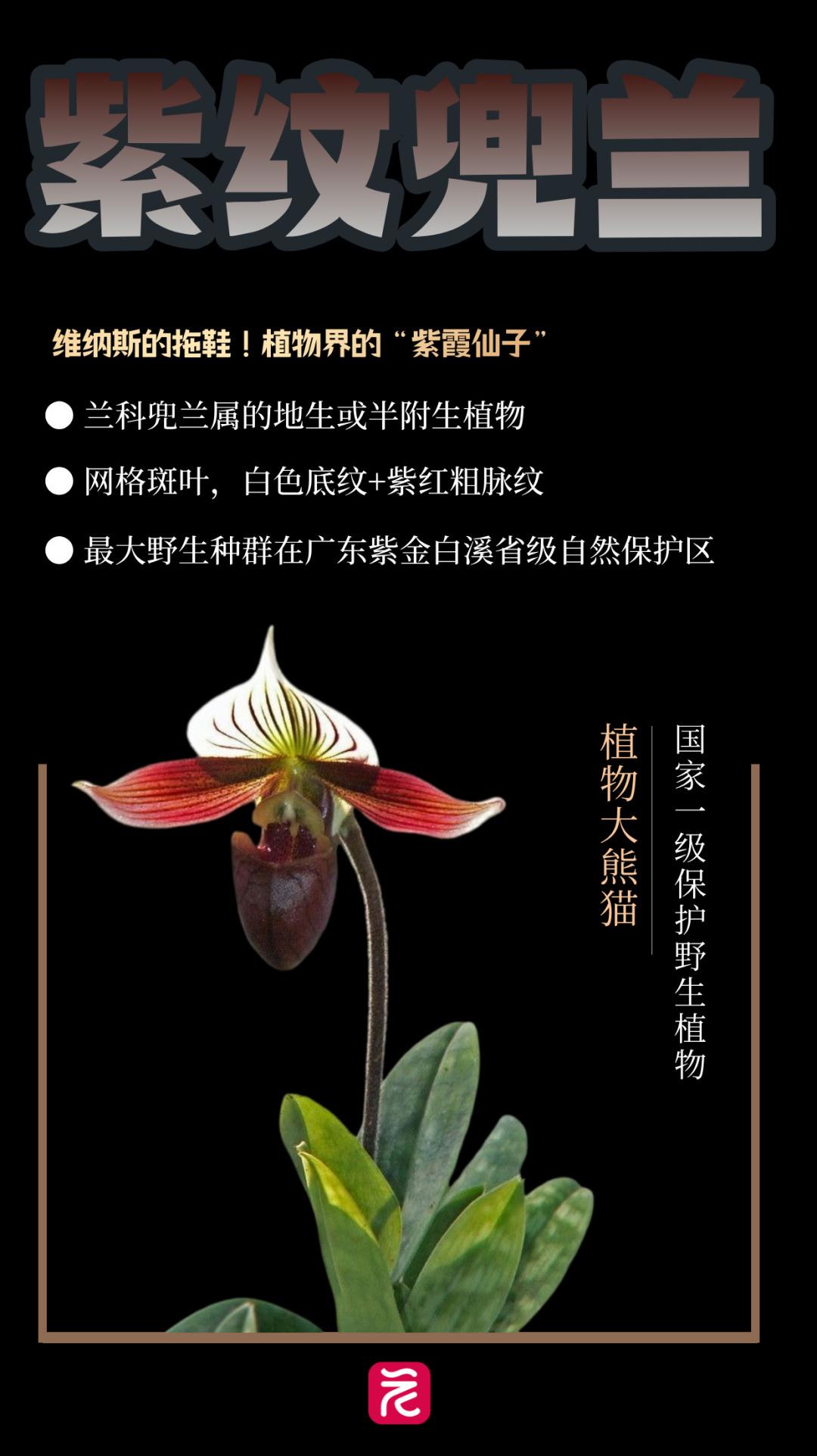 紫纹兜兰是兰科兜兰属植物,其花朵形态独特,唇瓣呈囊状,布满深紫色纹路,宛如艺术品。然而,由于自身繁殖困难、生境破坏及人为盗采等因素,该物种已被列入《濒危野生动植物种国际贸易公约》附录Ⅰ。