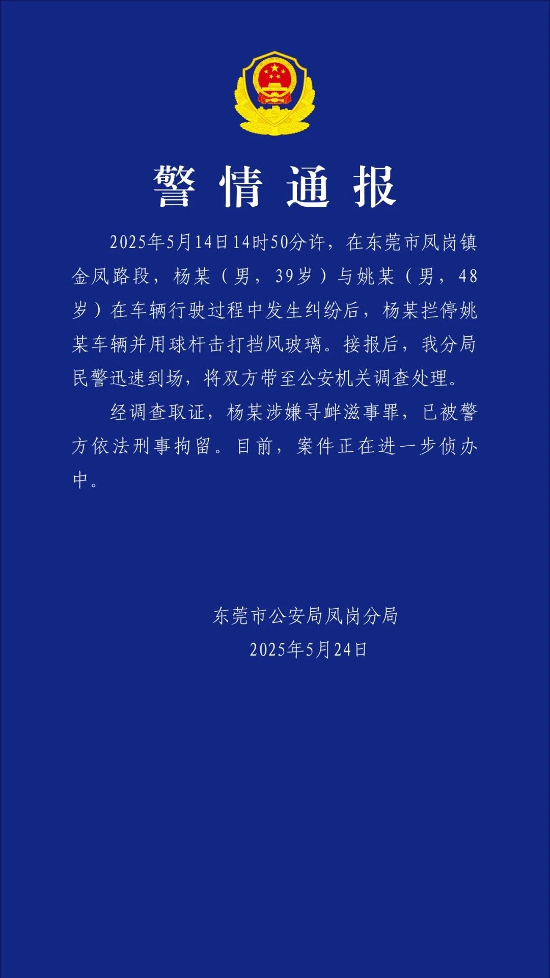 5月24日,东莞市公安局凤岗分局发布警情通报称,5月14日14时50分许,在东莞市凤岗镇金凤路段,杨某(男,39岁)与姚某(男,48岁)在车辆行驶过程中发生纠纷后,杨某拦停姚某车辆并用球杆击打挡风玻璃。