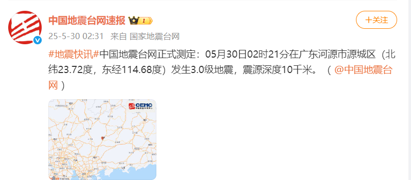 中国地震台网正式测定:5月30日2时21分在广东河源市源城区(北纬23.72度,东经114.68度)发生3.0级地震,震源深度10千米。