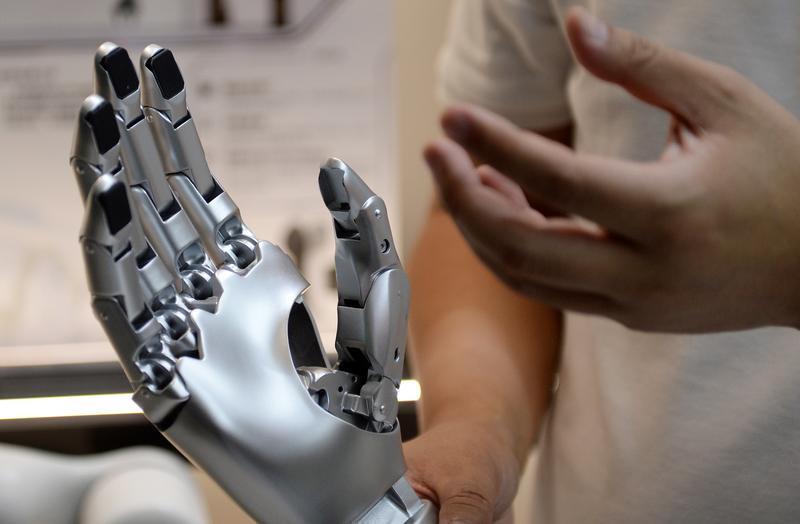 墨现科技(东莞)有限公司,工作人员讲解机器人灵巧手上的电子皮肤