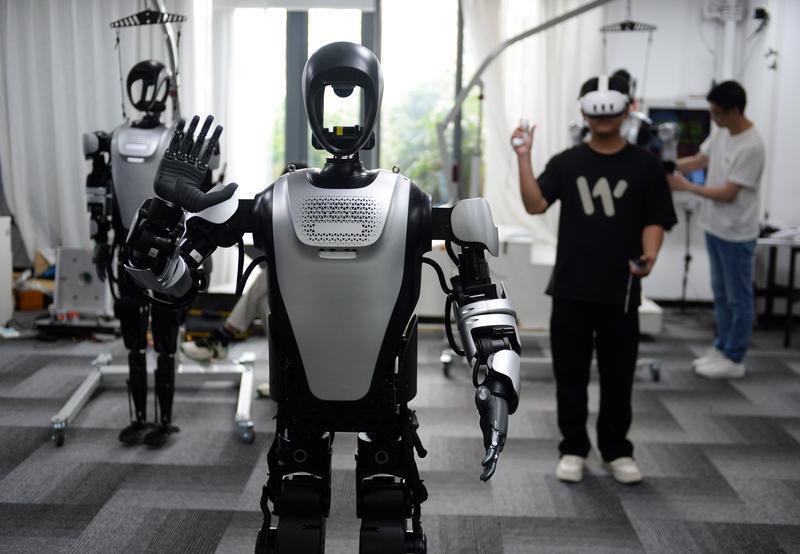 乐聚(深圳)机器人技术有限公司,工作人员在操控机器人同步动作