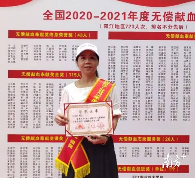 因此,回到阳江后,她每年都定期去献血,截至目前,在阳江已累计献血25次,献血量达8400毫升。