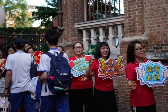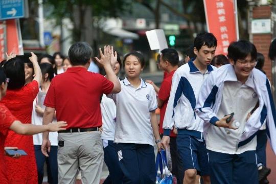 东莞中学松山湖学校考点外,老师与同学击掌,为考生送祝福。