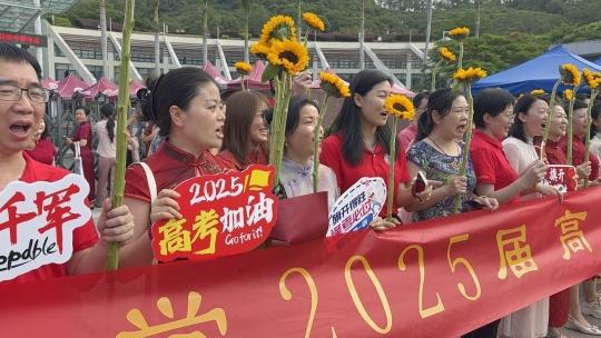 深圳红岭中学考点外,送考家长手举象征“一举夺魁”的向日葵花为考生送考加油!