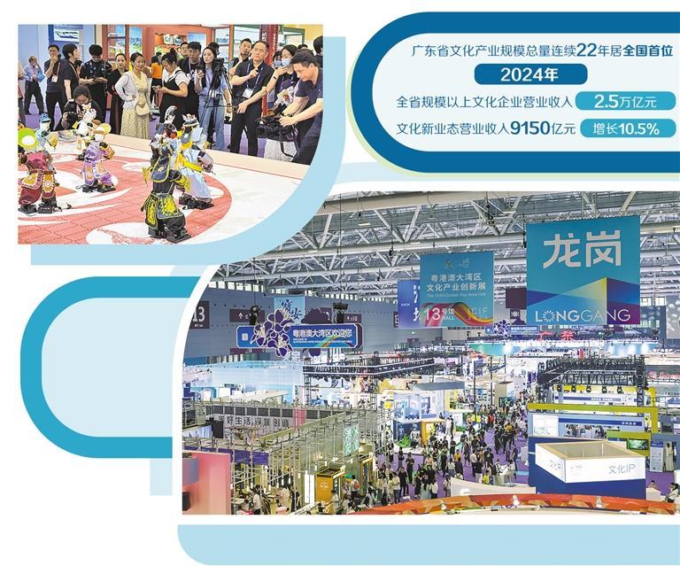作为我国文化产业第一大省,广东省文化产业规模总量连续22年居全国首位。2024年,全省规模以上文化企业营业收入2.5万亿元,约占全国六分之一;文化领域新质生产力不断壮大,文化新业态营业收入9150亿元,增长10.5%,在数字创意、动漫游戏、网络视听、数字文化制造等领域形成较强竞争优势。