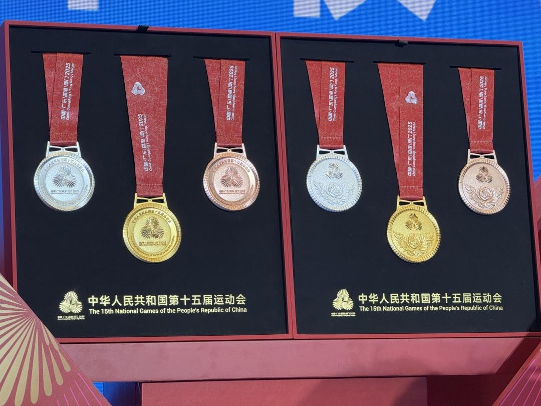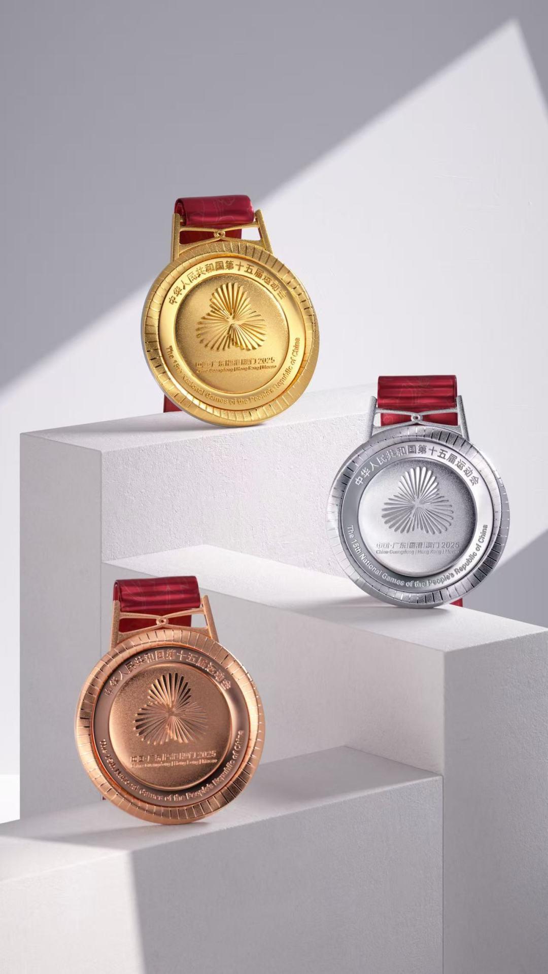 竞技体育项目奖牌重354.5克,一面正中上方的会徽由代表粤港澳三地的花瓣交叠扭转形成同心礼花,下方牡丹花托举而上,寓意粤港澳大湾区依托祖国的坚实后盾蓬勃发展,为民族复兴贡献力量;另一面中间的吉祥物中华白海豚手举火炬,灵动活泼,周围浪涛造型的数字“15”巧妙地将全运会届别与体育精神的传承完美结合。