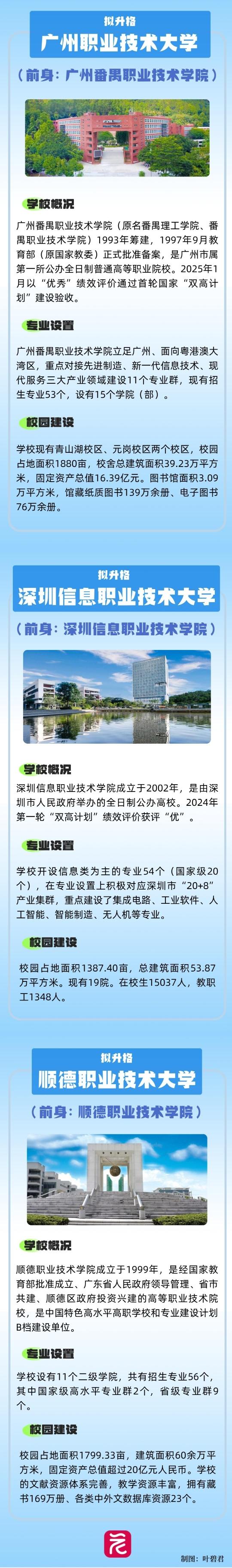 此外,今年5月,教育部公示增设职业本科,来自广东的有3所,分别是广州番禺职业技术学院拟升格为广州职业技术大学、深圳信息职业技术学院拟升格为深圳信息职业技术大学、顺德职业技术学院拟升格为顺德职业技术大学,教育部批复后就可正式改名大学。