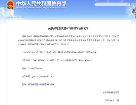 6月11日,教育部官方发布关于拟同意设置本科高等学校的公示。公示称,拟同意设置包括大湾区大学在内的10所学校。