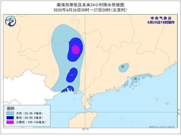 降水预报:6月26日20时至27日20时,广东中部沿海、广西、贵州东南部等地的部分地区有大到暴雨,其中,广西北部局部地区有大暴雨(100~150毫米)。