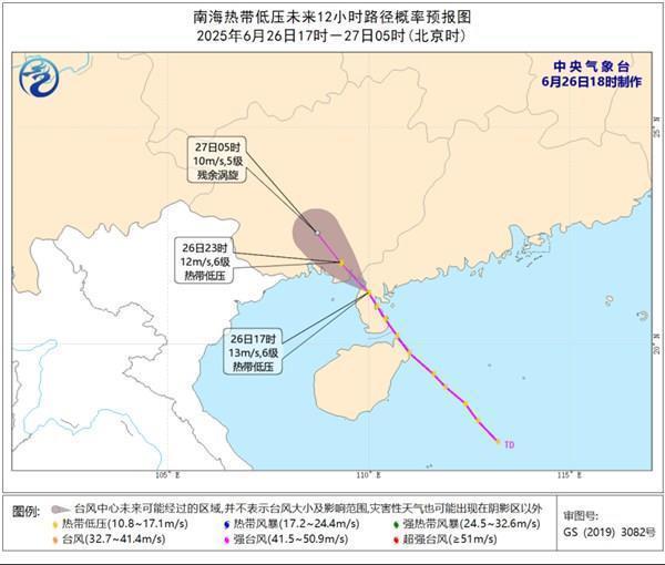 南海热带低压的中心今天(6月26日)下午5点位于广东省湛江市遂溪县境内,就是北纬21.2度、东经110.0度,中心附近最大风力6级(13米/秒),中心最低气压为998百帕。