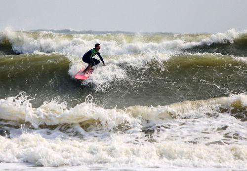 一名冲浪运动员在“逐浪前行”。(陈史摄)