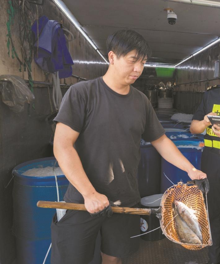 凌晨1时许,大桥口岸货运查验台。夏夜的海风裹挟着咸腥,与此刻待查车辆开门瞬间扑向港珠澳大桥海关关员龚忠年的味道一样。这是一车鲜活金鲳鱼、虾蟹等,40分钟前从斗门水产养殖中转场运来,经大桥口岸通关送往香港的早市。他利落地攀上车厢,站在十几个挂着增氧设备的大水桶中间,手电光精准扫过水箱,水花翻腾,鱼影游曳。龚忠年和同事快速抽查活鱼,一一核对货证,“状态不错,单货一致,放行!”他跳下车,朝潘伟亮示意,整个查验过程不到20分钟。“多谢龚科,水产耽搁不起啊。”潘伟亮立即启动货车离场。望着车子汇入夜色,龚忠年长舒一口气。作为拱北海关所属港珠澳大桥海关监管四科科长,他比谁都明白,鲜活水产对通关时效的要求近乎苛刻。