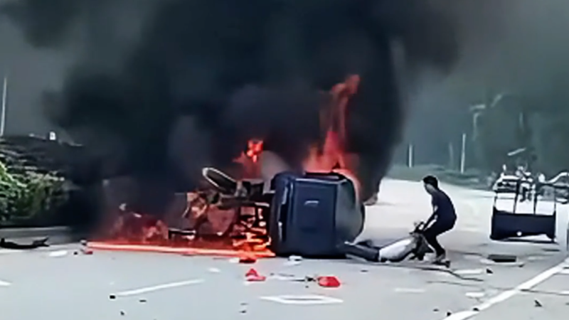 5月1日,韶关始兴县太平镇永安大道路段发生车祸,一辆侧翻的三轮车燃起冲天大火。浓烟裹挟着火焰吞噬驾驶室,驾驶员吸入浓烟后昏迷,被变形的车门死死卡住,情况紧急。