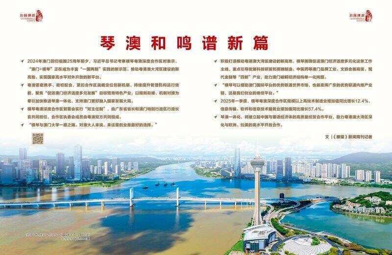 2024年澳门回归祖国25周年前夕,习近平总书记考察横琴粤澳深度合作区时表示,“澳门+横琴”正在成为丰富“一国两制”实践的新示范、推动粤港澳大湾区建设的新高地、实现国家高水平对外开放的新平台。