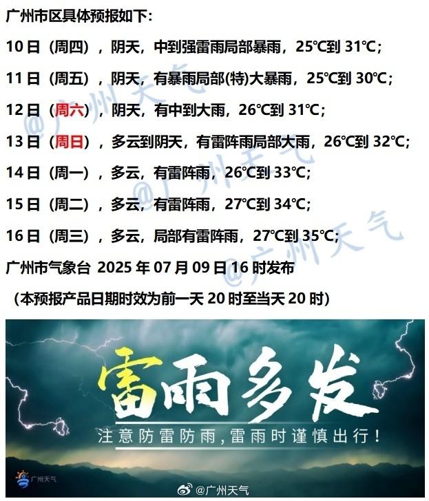 另据广州气象台,10日,广州市区阴天,有中到强雷雨局部暴雨,气温在25℃-31℃;11日,阴天,有暴雨局部(特)大暴雨,气温在25℃-30℃;12日,阴天,有中到大雨,气温在26℃-31℃。