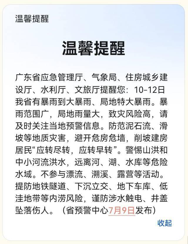 9日,广东省应急管理厅、气象局等多部门联合发布提醒短信:10-12日我省有暴雨到大暴雨、局地特大暴雨。