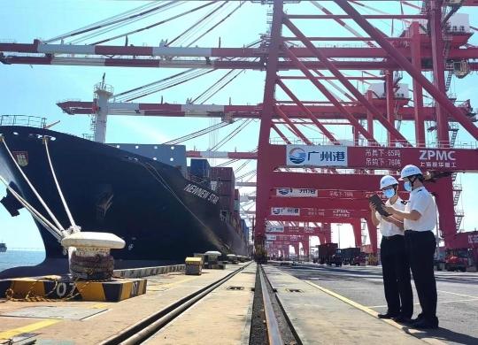 广州海关所属南沙海关关员对即将出口的“一港通”货物进行监管。