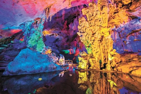 从该公园往北走四十分钟,就到连州地下河了。入口处有关山月写的“连州地下河”几个大字。夏日炎炎,钻进洞里却凉气袭人。钟乳石在这儿长了亿万年,石笋像剑一样戳向头顶,石幔垂挂着,活像琉璃帘子。工作人员张建军说:“里头分三层。最底下是地下河,流出景区就变成明河,先流进连江,最后汇入北江。上面两层是旱洞,石笋每年仍能长1毫米;石灰岩的颜色是丰富多彩的,洞口上方是一大片白色崖壁,构成边石坝景观,层层叠叠,如梯田般一直延伸到地下河,堪称一绝,宛如一座地下艺术宫殿。”