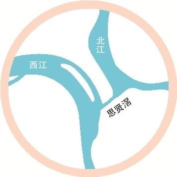 北江通过思贤滘与西江连通。两江随后分道扬镳,勾勒出一个“双月湾”。(示意图)