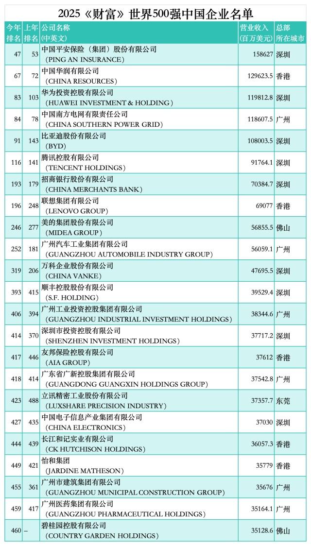 7月29日,《财富》杂志发布2025年世界500强排行榜,130家中国企业进入榜单,按照上榜企业总部所在城市统计,粤港澳大湾区共有23家企业上榜,相较2024年增加一家企业,其中排名最高的是中国平安,位列第47名。