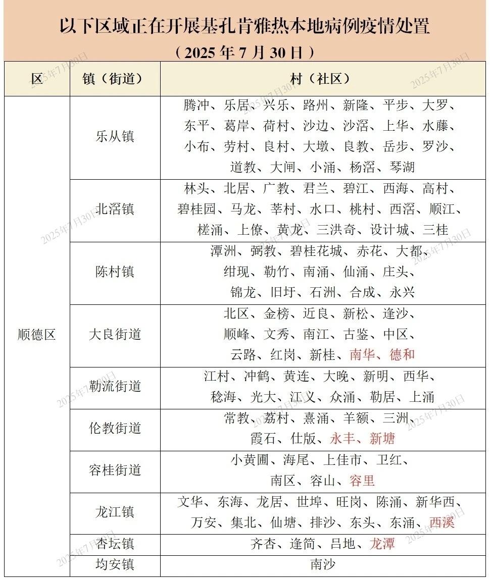记者还从顺德疾控获悉,截至7月30日,顺德区以下区域正在开展基孔肯雅热疫情处置: