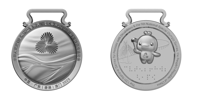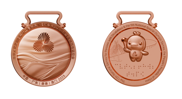 奖牌背面,以中华白海豚为原型设计的吉祥物跃然牌上。吉祥物浮雕高擎火炬,象征奥林匹克精神生生不息、代代相传。浮雕下方创新性地应用了盲文,其中第一行为“残特奥会”,第二行分别为“金牌”“银牌”“铜牌”。体现了对参赛者的用心与尊重,让视障运动员能够亲手触摸这份沉甸甸的荣耀,真切感受属于他们的荣光。