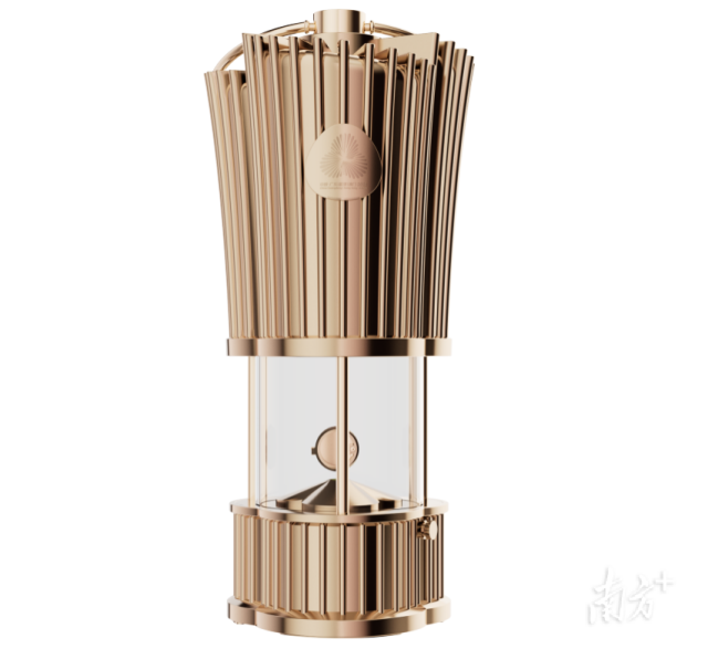 上部为会徽形状,中部为耐高温高透玻璃与象征粤港澳三地的三根支柱,共同构成火种展示区。下部为支撑粤港澳三地的三瓣底座,用于支撑火种。顶部为环形提手。整体来看,底部汇聚如火种,顶部舒展似火焰,流畅的渐变线条勾勒出动态升腾之姿,三根支柱支撑起顶部三瓣礼花。点燃后,光线穿透灯体,内部精密折射结构使光源展现粒子散射效果,宛若无数运动员精神火花在此汇聚绽放,为前行之路提供恒久的精神指引。