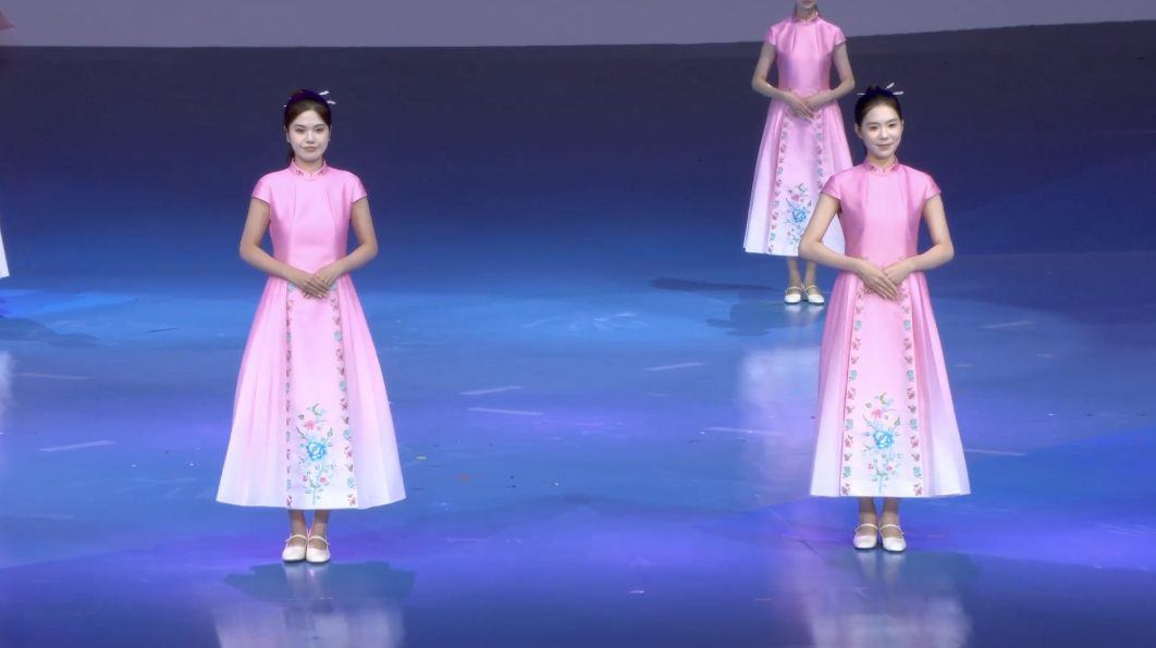 这件以马面裙为核心载体的颁奖礼服,设计灵感来源于粤绣牡丹一枝独秀。而裙身上精湛的三蓝绣工艺等元素,则象征着大湾区三地和谐繁荣、开放包容、生态文明的特色。此外,衣服的整体颜色以粉色为主,象征着希望、青春和活力。