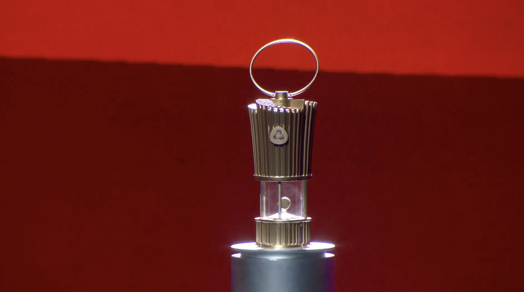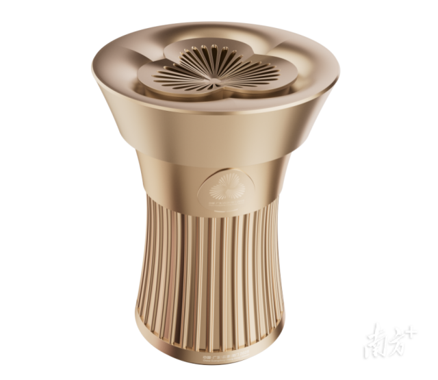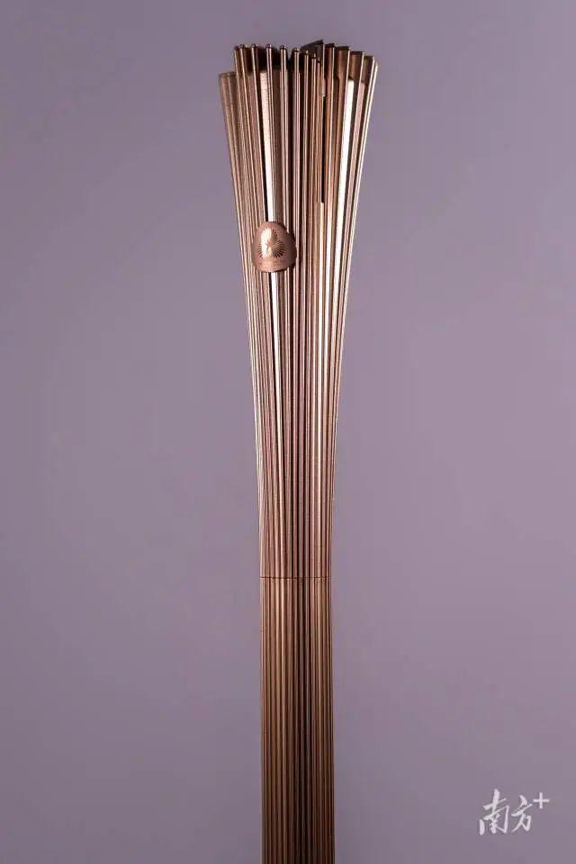 火炬以流线型金属为骨,在光影流转中呈现“礼花绽放”的动态美感,也选取了金色这一礼花绽放的代表色调。底部为牡丹纹印,不仅蕴含在祖国的关怀引领下,粤港澳三地“人心相通、团结奋进”的美好期许,也呼应了运动员在赛场上突破极限、勇攀高峰的昂扬姿态。