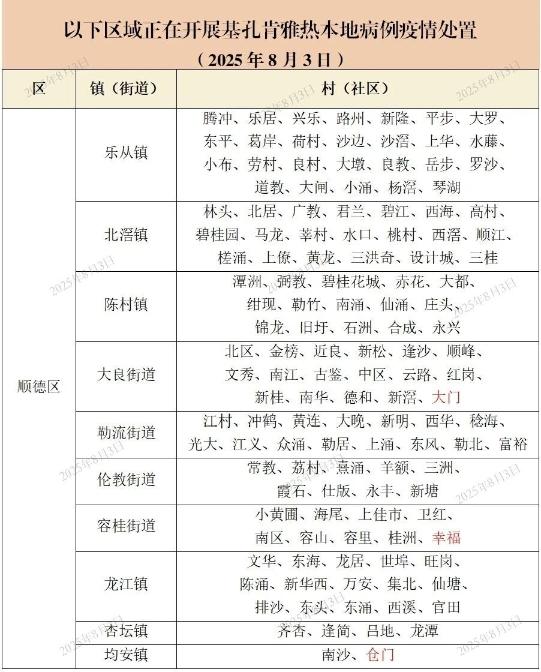 记者还从顺德疾控获悉,8月3日,大良街道、容桂街道、均安镇分别新增一村居正在开展基孔肯雅热本地病例疫情,防蚊灭蚊工作仍不可松懈。