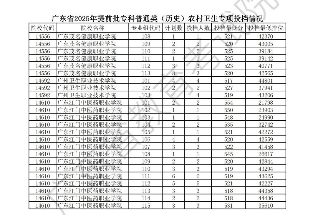 记者梳理专科农村卫生专项投档情况发现,今年该类型继续火爆,且比2024年更受追捧,所有院校专业组一次性满档,且投档线全部超过本科线,部分接近特控线。在历史类,投档线最高554分,较去年上涨31分,出自广东江门中医药职业学院101专业组,投档最低排位21798,招生计划为2人。该校102专业组最低投档分550分,投档最低排位23903,招生计划1人,位居第二;103专业组最低投档分548分,投档最低排位24990,招生计划1人,位居第三。广州卫生职业技术学院101专业组最低投档分517分,投档最低排位44801,招生计划4人,排在该类别最后一位。