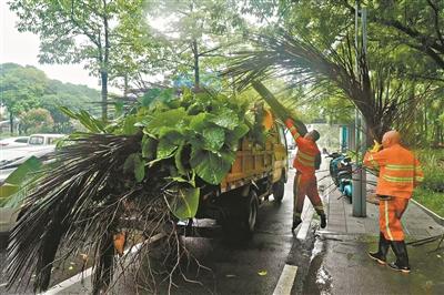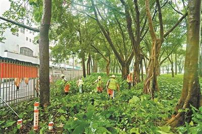工作人员清理绿化带。广州日报全媒体记者陈枫 摄