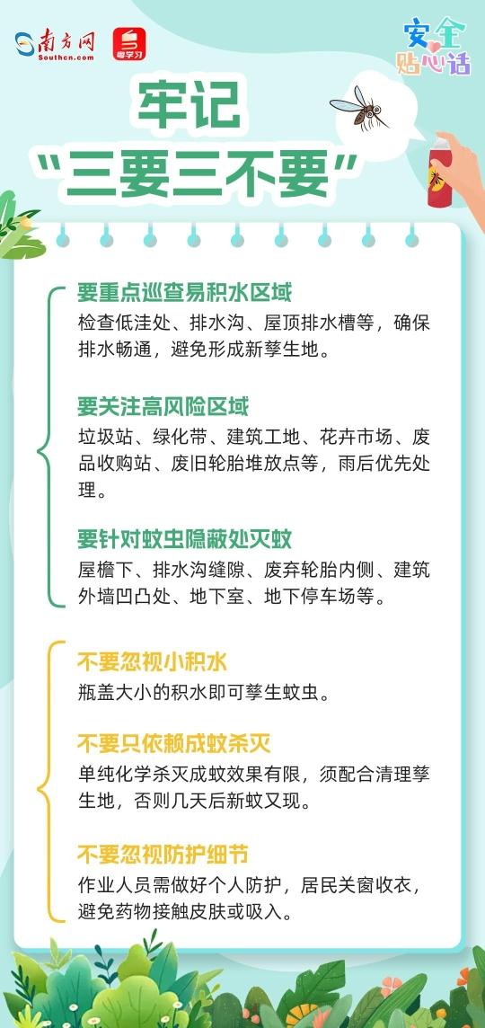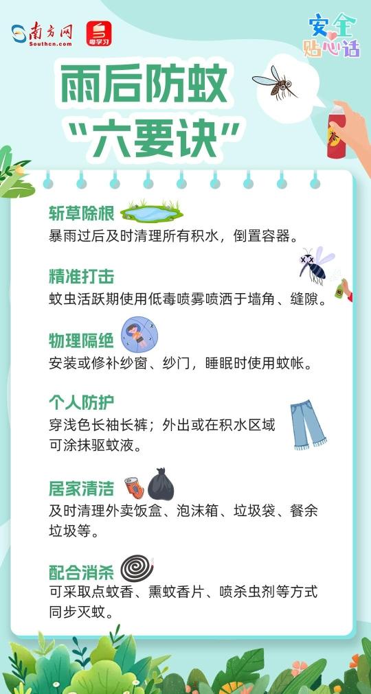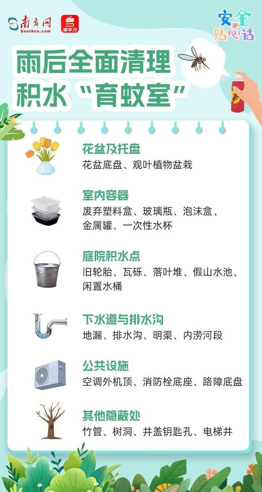 广东本轮暴雨结束,高温接力上线。连日来的强降雨带来大量积水,而蚊虫容易在积水环境中生长繁殖。雨后及时清积水、清除蚊虫孳生地,是防蚊灭蚊、预防蚊媒传染病传播的有效手段。
